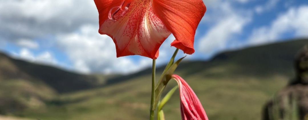 We weren’t planning to drive so many passes, but it ended up to be just that. The next pass we did was the Carlisleshoekspruit Pass (https://www.mountainpassessouthafrica.co.za/find-a-pass/eastern-cape/170-carlislehoekspruit-pass.html) to Tiffendell. Rod and Rachel often went up there looking for cold hardy plants. Unfortunately Tiffendell Ski Resort has closed its doors, so we couldn’t spend the night, but we went up and down and saw the most amazing plants and views. Erica was the driver and did very well as we had no idea what the pass was like. Geranium robustum, Kniphofia northiae, hirsuta and caulescens, Gladiolus longicollis, Berkheya purpurea and cirsiifolia, Glumicalyx nutans, Senecio macrocephalus, Helichrysum aureum not to forget Dierama robustum, just to mention a few.